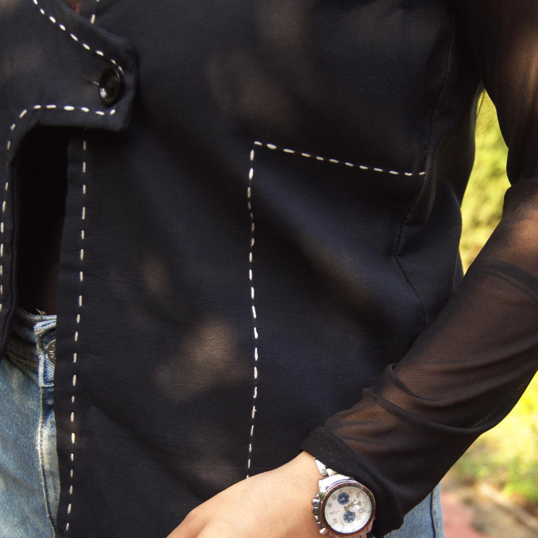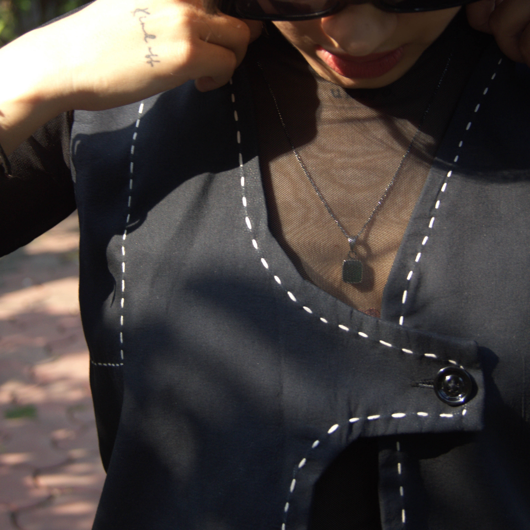 Contrast Hand-Stitch Detailing – delicate white hand-stitch embroidery highlights the neckline, front, and seams, adding artisanal charm.